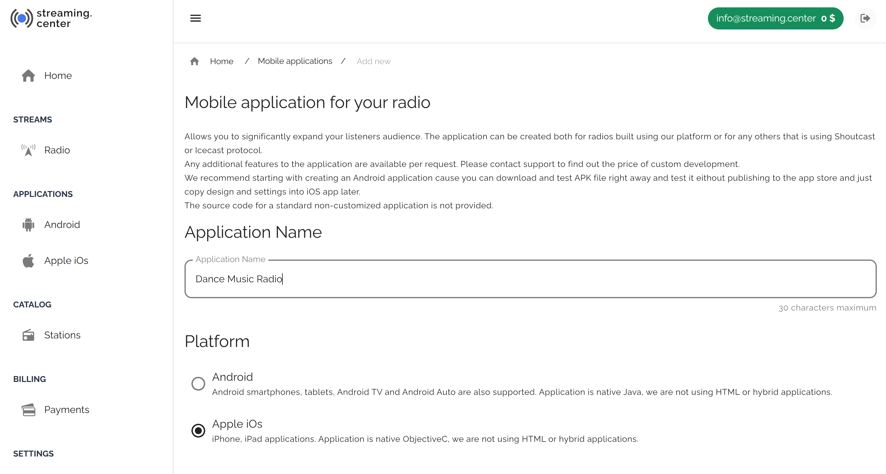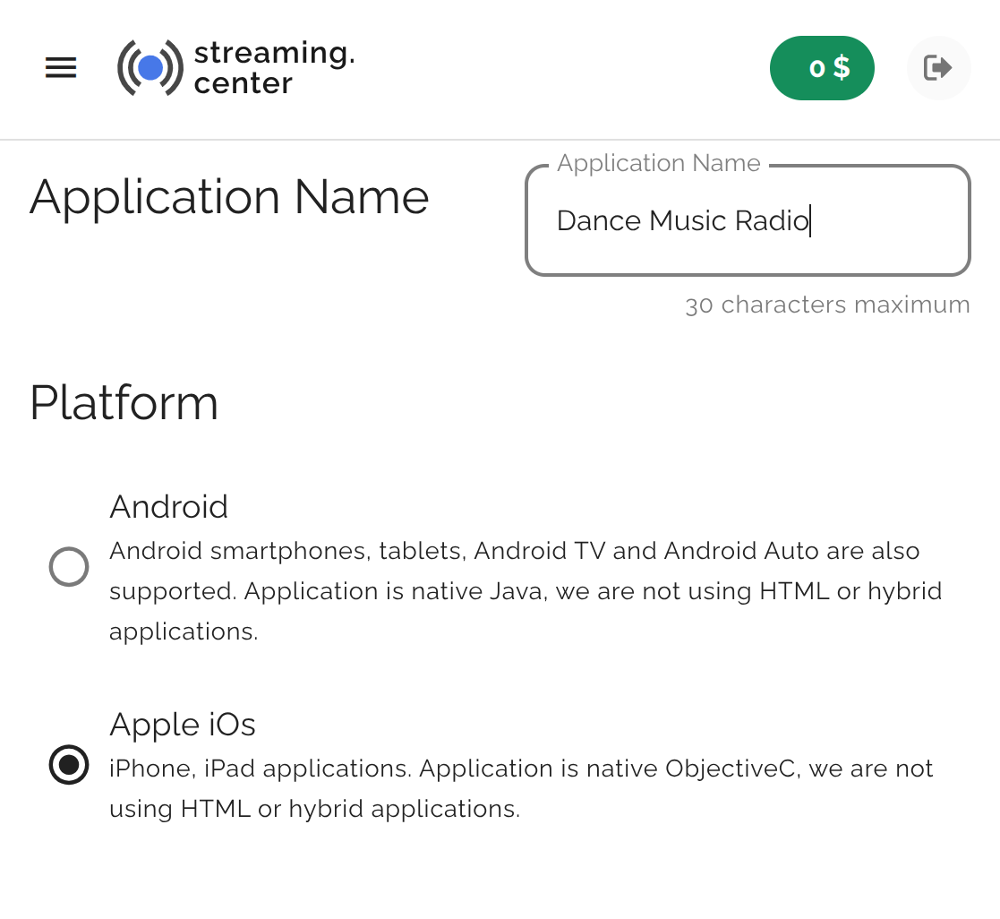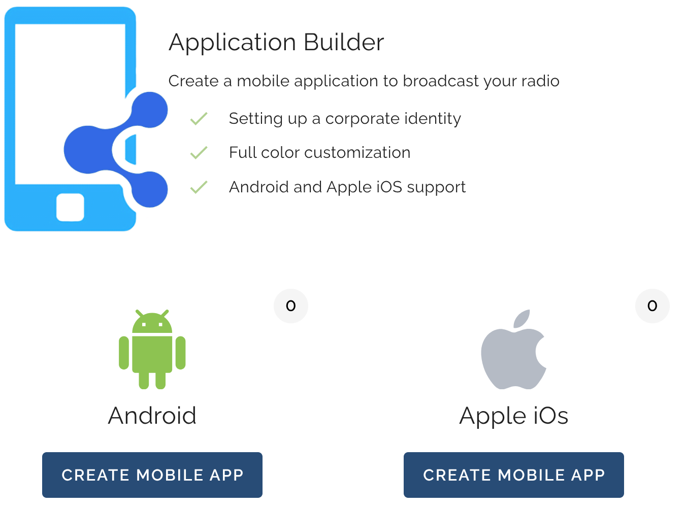- Minimal technical support, with the basic version requiring you to simply fill out the app creation form (specify the name, description, logos, and radio streams).