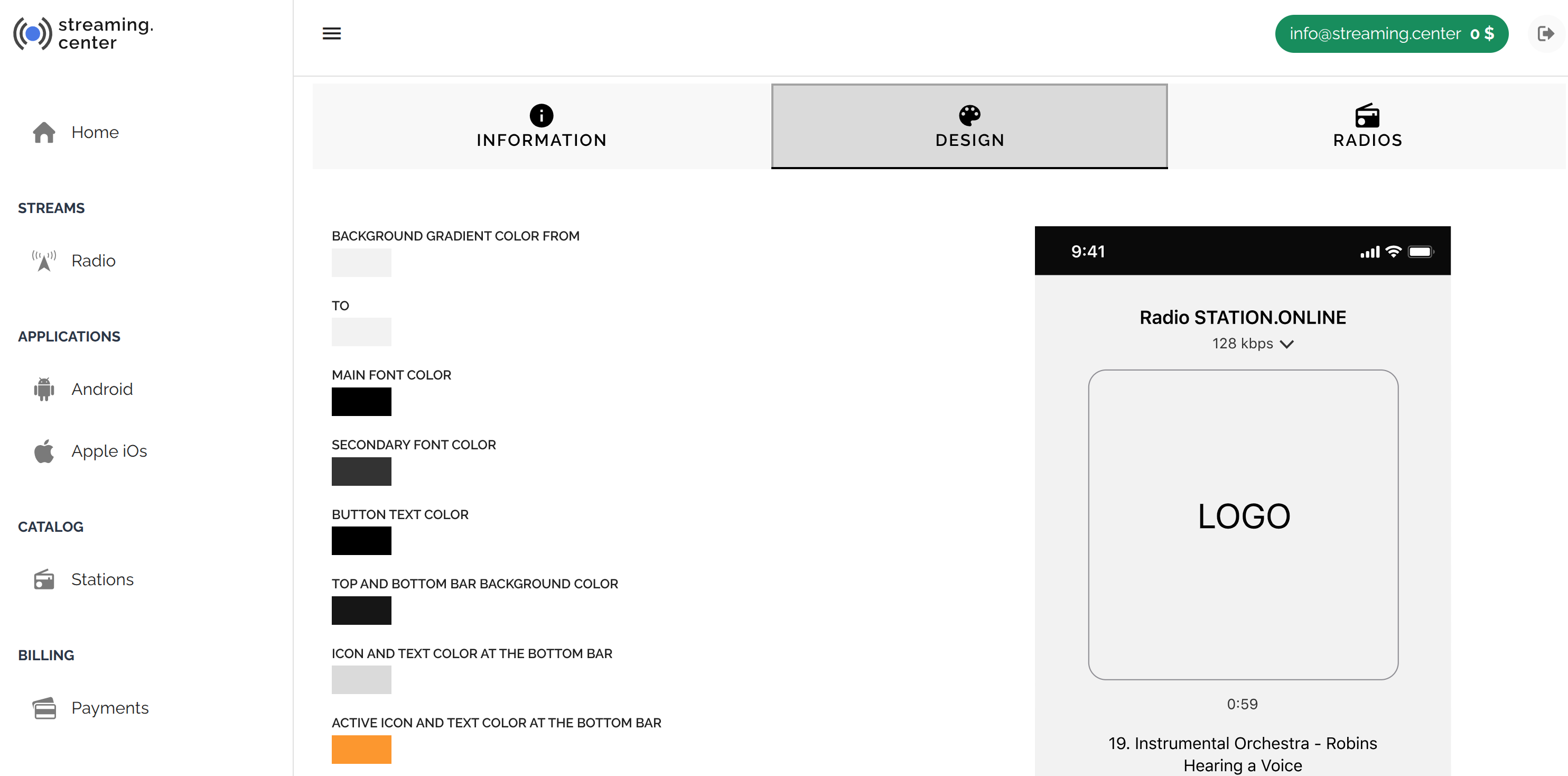 Customize the appearance of the app in the “Design” section: you can either choose a ready-made “skin” or customize all element colors individually.