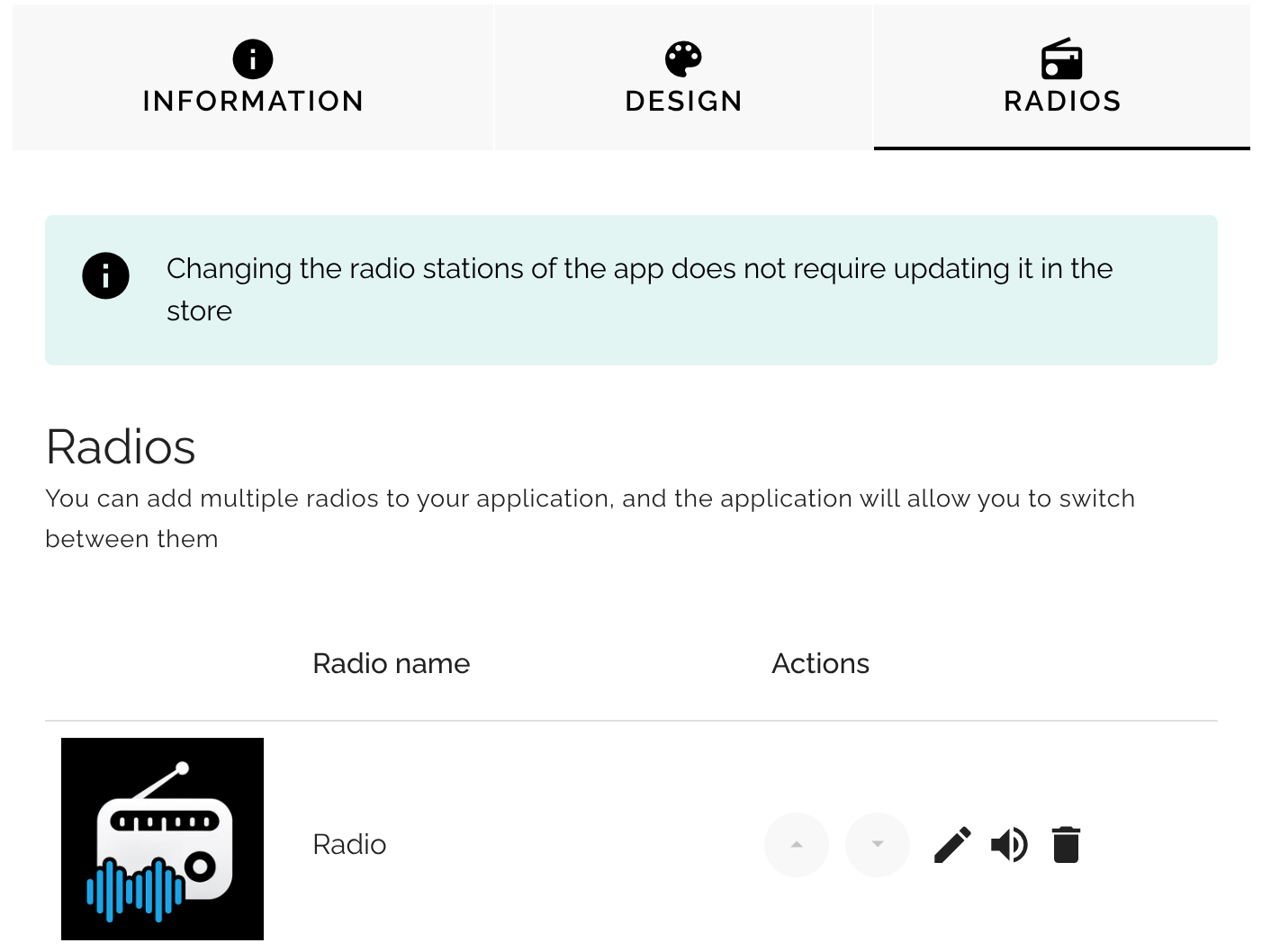 Each station in the app can have its own logo, radio streams, social media links, and text for the “Info” section in the app.